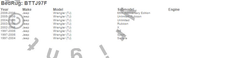 Below is an abbreviated list of applications for the BedTred Floor Kit.Wrangler (TJ), Jeep, 2006, 2005, 2004, 2003, 2002, 2001, 2000, 1999, 1998, 1997