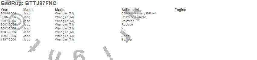 Below is an abbreviated list of applications for the BedTred Floor Kit.Wrangler (TJ), Jeep, 2006, 2005, 2004, 2003, 2002, 2001, 2000, 1999, 1998, 1997