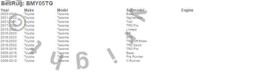 Below is an abbreviated list of applications for the BedRug Tailgate Mat.Tacoma, Toyota, 2023, 2022, 2021, 2020, 2019, 2018, 2017, 2016, 2015, 2014, 2013, 2012, 2011, 2010, 2009, 2008, 2007, 2006