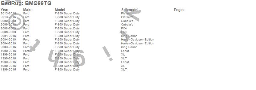 Below is an abbreviated list of applications for the BedRug Tailgate Mat.F-250 Super Duty, F-350 Super Duty, Ford, 2016, 2015, 2014, 2013, 2012, 2011, 2010, 2009, 2008, 2007, 2006, 2005, 2004, 2003, 2002, 2001, 2000