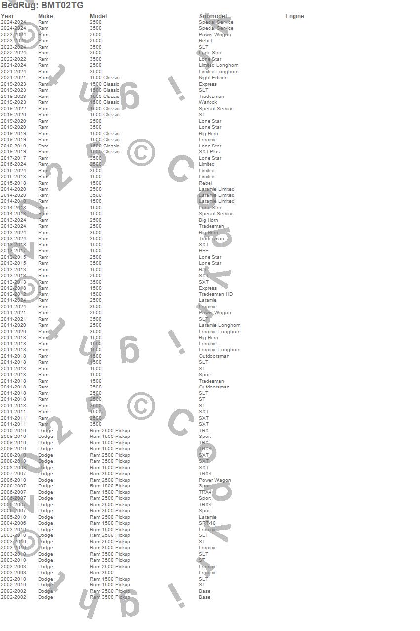 Below is an abbreviated list of applications for the BedRug Tailgate Mat.1500, 1500 Classic, 2500, 3500, Ram 1500, Ram 2500, Ram 3500, Dodge, Ram, 2024, 2023, 2022, 2021, 2020, 2019, 2018, 2017, 2016, 2015, 2014