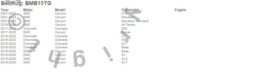 Below is an abbreviated list of applications for the BedRug Tailgate Mat.Canyon, Colorado, Chevrolet, GMC, 2022, 2021, 2020, 2019, 2018, 2017, 2016, 2015