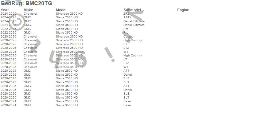 Below is an abbreviated list of applications for the BedRug Tailgate Mat.Sierra 2500 HD, Sierra 3500 HD, Silverado 2500 HD, Silverado 3500 HD, Chevrolet, GMC, 2025, 2024, 2023, 2022, 2021, 2020
