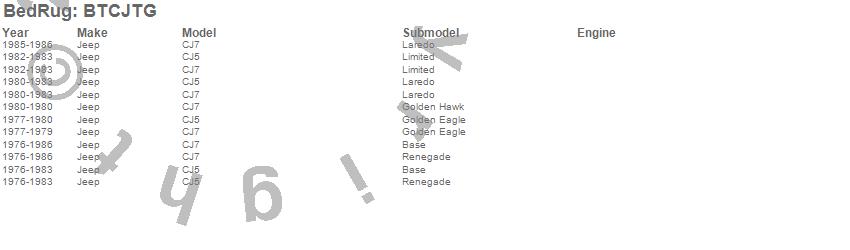 Below is an abbreviated list of applications for the BedTred Tailgate Mat.CJ5, CJ7, Jeep, 1986, 1985, 1984, 1983, 1982, 1981, 1980, 1979, 1978, 1977, 1976