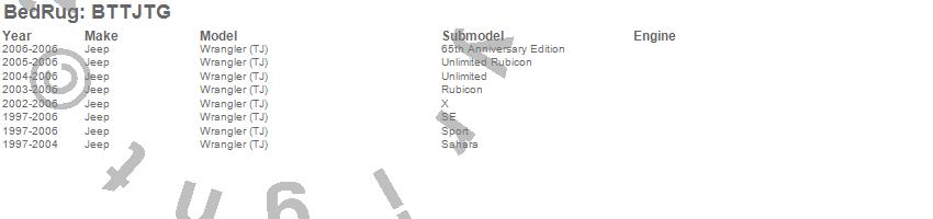 Below is an abbreviated list of applications for the BedTred Tailgate Mat.Wrangler (TJ), Jeep, 2006, 2005, 2004, 2003, 2002, 2001, 2000, 1999, 1998, 1997