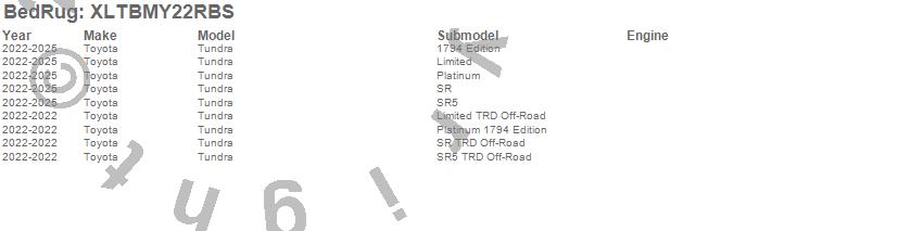 Brand: BedRugPart Number: XLTBMY22RBSTruck Bed Mat Type: For Use w/Spray On Bed Liner And Non Liner ApplicationsUPC: 870558007642