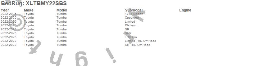 Brand: BedRugPart Number: XLTBMY22SBSTruck Bed Mat Type: For Use w/Spray On Bed Liner And Non Liner ApplicationsUPC: 870558007659