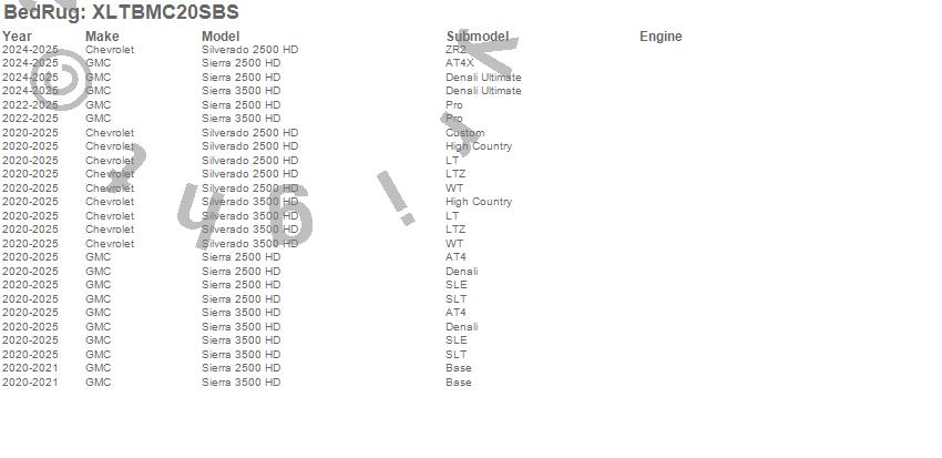Below is an abbreviated list of applications for the XLT Mat.Sierra 2500 HD, Sierra 3500 HD, Silverado 2500 HD, Silverado 3500 HD, Chevrolet, GMC, 2025, 2024, 2023, 2022, 2021, 2020