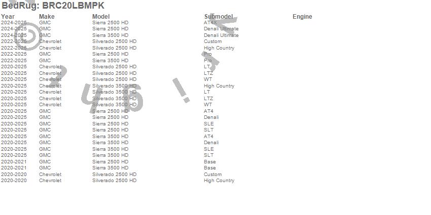 Below is an abbreviated list of applications for the BedRug Complete Truck Bed Liner.Sierra 2500 HD, Sierra 3500 HD, Silverado 2500 HD, Silverado 3500 HD, Chevrolet, GMC, 2025, 2024, 2023, 2022, 2021, 2020