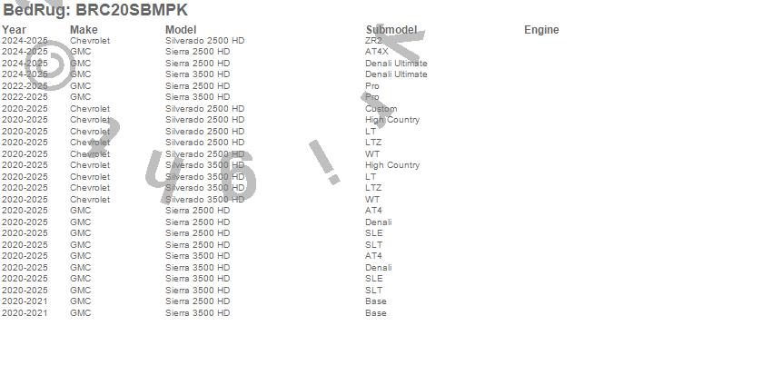 Below is an abbreviated list of applications for the BedRug Complete Truck Bed Liner.Sierra 2500 HD, Sierra 3500 HD, Silverado 2500 HD, Silverado 3500 HD, Chevrolet, GMC, 2025, 2024, 2023, 2022, 2021, 2020