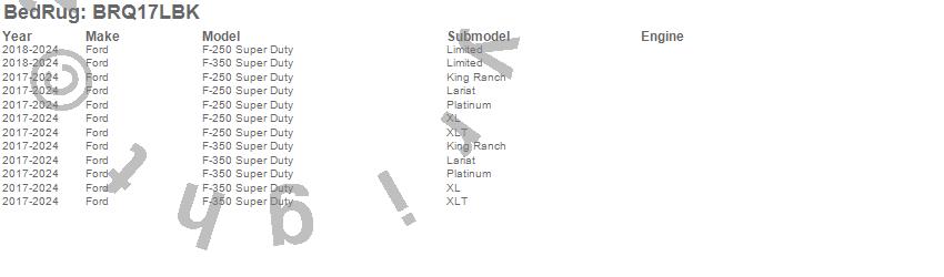 Below is an abbreviated list of applications for the BedRug Complete Truck Bed Liner.F-250 Super Duty, F-350 Super Duty, Ford, 2024, 2023, 2022, 2021, 2020, 2019, 2018, 2017