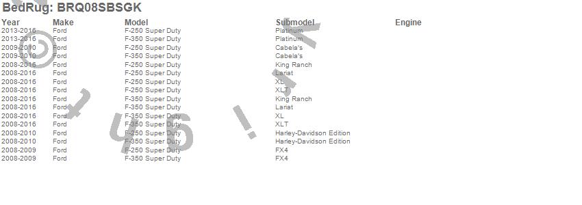 Below is an abbreviated list of applications for the BedRug Complete Truck Bed Liner.F-250 Super Duty, F-350 Super Duty, Ford, 2016, 2015, 2014, 2013, 2012, 2011, 2010, 2009, 2008