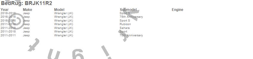 Below is an abbreviated list of applications for the BedRug Cargo Kit.Wrangler (JK), Jeep, 2018, 2017, 2016, 2015, 2014, 2013, 2012, 2011