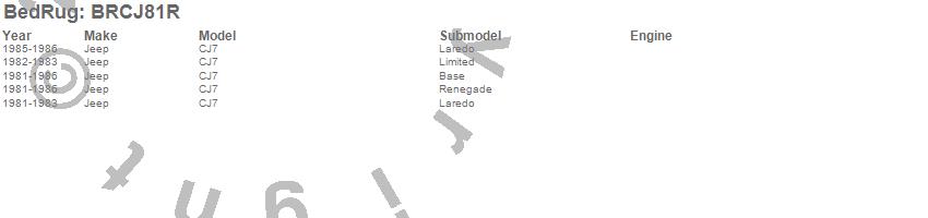 Below is an abbreviated list of applications for the BedRug Cargo Kit.CJ7, Jeep, 1986, 1985, 1984, 1983, 1982, 1981