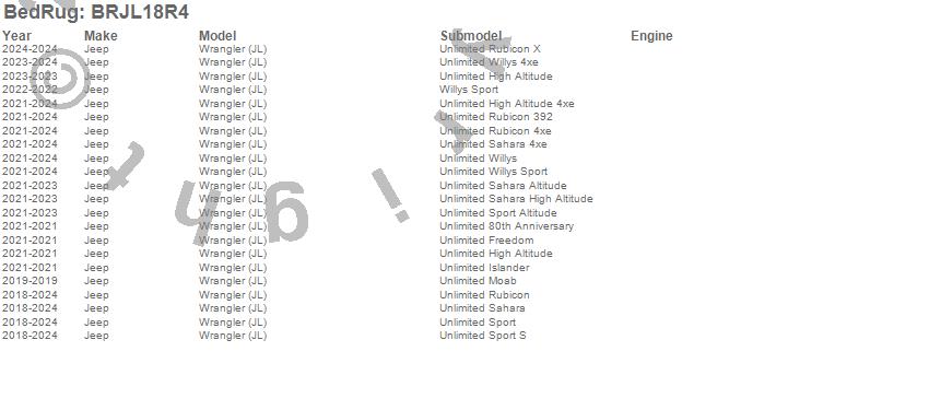 Below is an abbreviated list of applications for the BedRug Cargo Kit.Wrangler (JL), Jeep, 2024, 2023, 2022, 2021, 2020, 2019, 2018