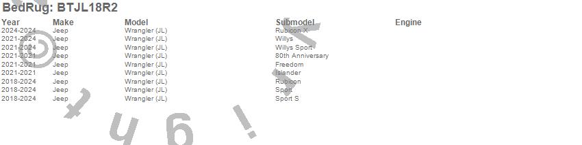 Brand: BedRugPart Number: BTJL18R2Floor Liner Type: 4 pc. Rear Kit - Incl. Drivers Wheel Well/ Passengers Wheel Well/ Rear Cargo Floor/ TailgateUPC: 870558097278
