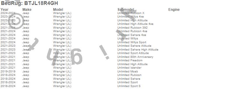 Below is an abbreviated list of applications for the BedTred Cargo Kit.Wrangler (JL), Jeep, 2024, 2023, 2022, 2021, 2020, 2019, 2018