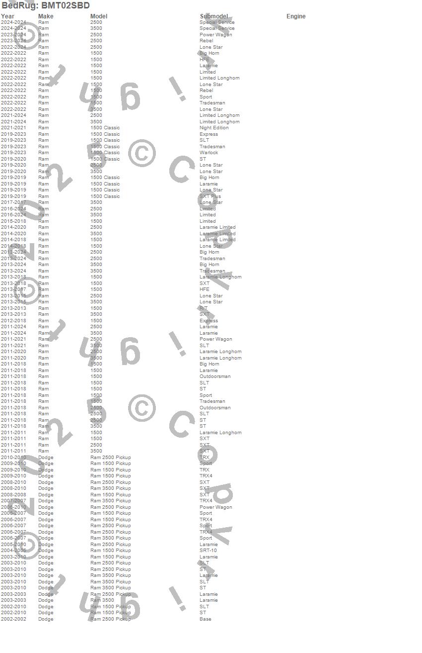 Below is an abbreviated list of applications for the BedRug Floor Truck Bed Mat.1500, 1500 Classic, 2500, 3500, Ram 1500, Ram 2500, Ram 3500, Dodge, Ram, 2024, 2023, 2022, 2021, 2020, 2019, 2018, 2017, 2016, 2015, 2014