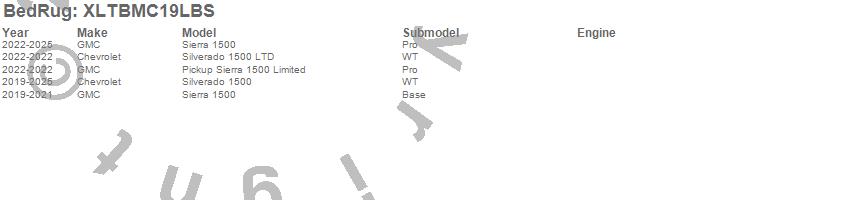 Brand: BedRugPart Number: XLTBMC19LBSTruck Bed Mat Type: For Use w/Spray On Bed Liner And Non Liner Applications - Fits Vehicles w/o Multi-Pro TailgateUPC: 870558006621