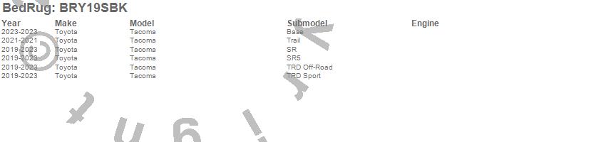 Brand: BedRugPart Number: BRY19SBKTruck Bed Liner Type: 3/4 in. Thick Floor - 1/4 in. Thick Side Walls - Incl. Bulkhead And Tailgate - Supersedes PN [BRY05SBK/BRY13SBK]UPC: 870558007062