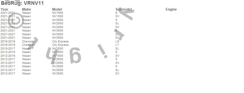 Below is an abbreviated list of applications for the VanRug Cargo Mat.City Express, NV1500, NV2500, NV3500, Chevrolet, Nissan, 2021, 2018, 2017, 2016, 2015, 2014, 2013, 2012