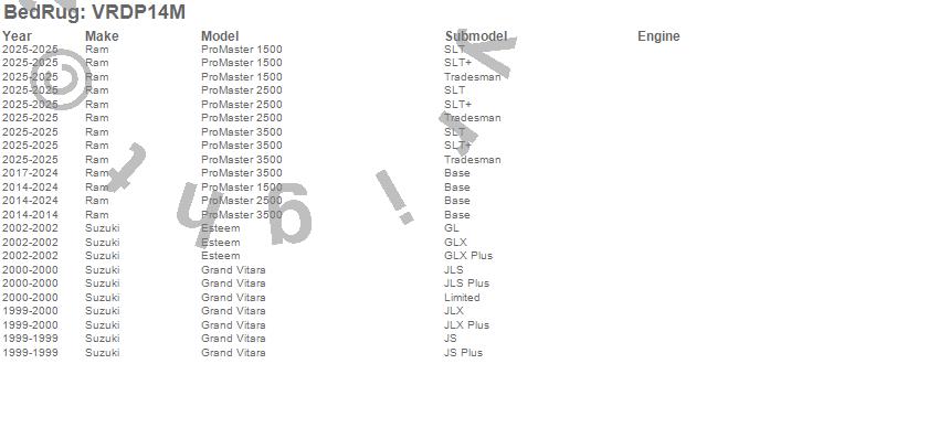 Below is an abbreviated list of applications for the VanRug Cargo Mat.Esteem, Grand Vitara, ProMaster 1500, ProMaster 2500, ProMaster 3500, Ram, Suzuki, 2025, 2024, 2023, 2022, 2021, 2020, 2019, 2018, 2017, 2016, 2015, 2014, 2002