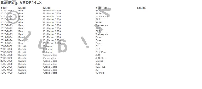 Below is an abbreviated list of applications for the VanRug Cargo Mat.Esteem, Grand Vitara, ProMaster 1500, ProMaster 2500, ProMaster 3500, Ram, Suzuki, 2025, 2024, 2023, 2022, 2021, 2020, 2019, 2018, 2017, 2016, 2015, 2014, 2002