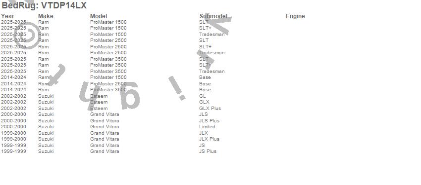 Below is an abbreviated list of applications for the VanTred Cargo Mat.Esteem, Grand Vitara, ProMaster 1500, ProMaster 2500, ProMaster 3500, Ram, Suzuki, 2025, 2024, 2023, 2022, 2021, 2020, 2019, 2018, 2017, 2016, 2015, 2014, 2002