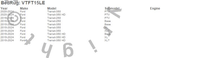 Below is an abbreviated list of applications for the VanTred Cargo Mat.Transit-250, Transit-350, Transit-350 HD, Ford, 2024, 2023, 2022, 2021, 2020, 2019, 2018, 2017, 2016, 2015