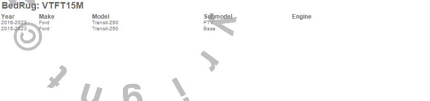 Brand: BedRugPart Number: VTFT15MCargo Area Liner Type: 1/2 in. Closed Cell Foam - Mat Size 114 1/2 in. x 68 5/16 in.UPC: 870558003644
