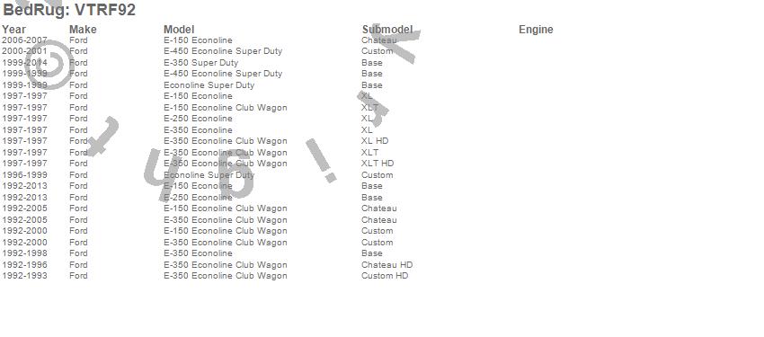 Below is an abbreviated list of applications for the VanTred Cargo Mat.E-150 Econoline, E-150 Econoline Club Wagon, E-250 Econoline, E-350 Econoline, E-350 Econoline Club Wagon, E-350 Super Duty, E-450 Econoline Super Duty, Econoline Super Duty, Ford, 2014, 2013, 2012, 2011, 2010, 2009, 2008, 2007, 2006, 2005, 2004