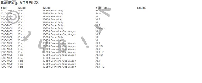 Below is an abbreviated list of applications for the VanTred Cargo Mat.E-150 Econoline, E-150 Econoline Club Wagon, E-350 Econoline, E-350 Econoline Club Wagon, E-350 Super Duty, E-450 Super Duty, Ford, 2014, 2013, 2012, 2011, 2010, 2009, 2008, 2007, 2006, 2005, 2000, 1999, 1998