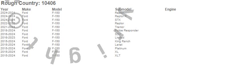 Brand: Rough CountryPart Number: 10406Truck Bed Rack Installation Kit Type: Aluminum - 750 lbs. Static Load - 400 lbs Dynamic LoadUPC: 840269919244