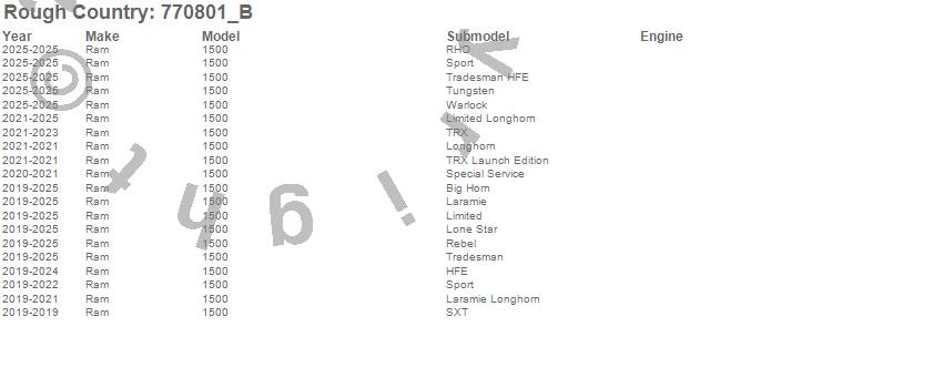 Brand: Rough CountryPart Number: 770801_BShock Absorber Type: Monotube - Rear - 4-5.5 in. Lift - 27.52 in. Extended Length - 16.34 Collapsed LengthUPC: 840269932724