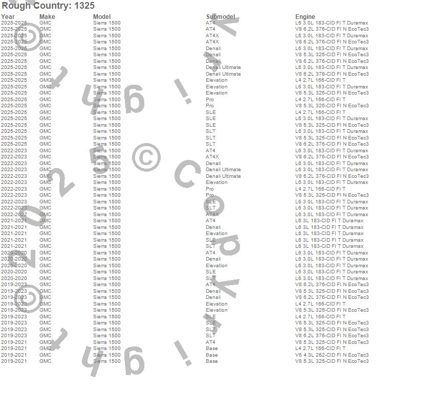 Below is an abbreviated list of applications for the Leveling Lift Kit.Sierra 1500, GMC, 2025, 2023, 2022, 2021, 2020, 2019