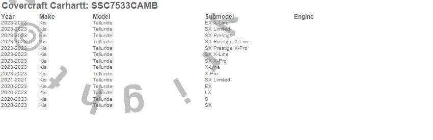 Below is an abbreviated list of applications for the Covercraft Carhartt SeatSaver.Telluride, Kia, 2025, 2024, 2023, 2022, 2021, 2020