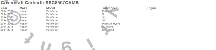 Below is an abbreviated list of applications for the Covercraft Carhartt SeatSaver.Pathfinder, Nissan, 2020, 2019, 2018, 2017, 2016, 2015, 2014