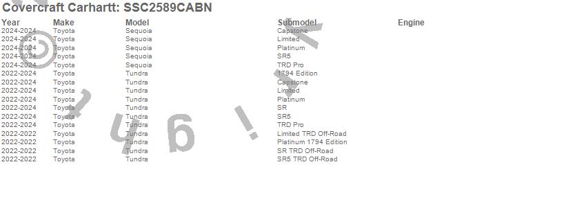 Below is an abbreviated list of applications for the Covercraft Carhartt SeatSaver.Sequoia, Tundra, Toyota, 2026, 2025, 2024, 2023, 2022