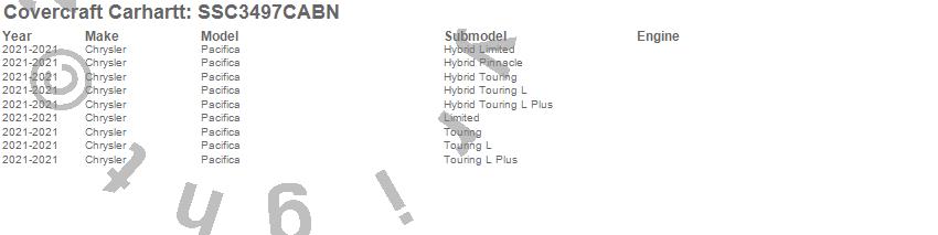Below is an abbreviated list of applications for the Covercraft Carhartt SeatSaver.Pacifica, Chrysler, 2021