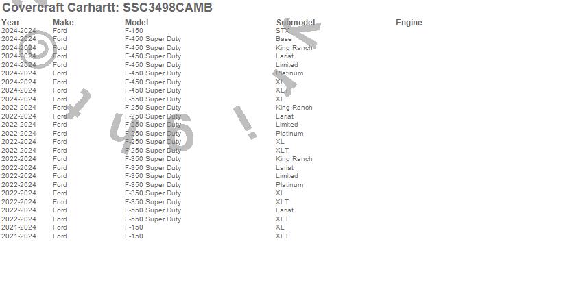 Below is an abbreviated list of applications for the Covercraft Carhartt SeatSaver.F-150, F-250 Super Duty, F-350 Super Duty, F-450 Super Duty, F-550 Super Duty, Ford, 2026, 2025, 2024, 2023, 2022, 2021