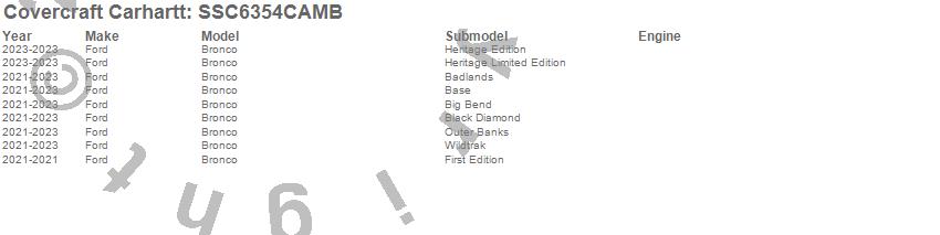 Below is an abbreviated list of applications for the Covercraft Carhartt SeatSaver.Bronco, Ford, 2025, 2024, 2023, 2022, 2021