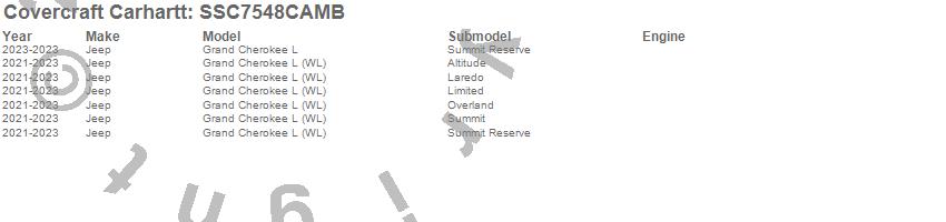 Below is an abbreviated list of applications for the Covercraft Carhartt SeatSaver.Grand Cherokee, Grand Cherokee L, Grand Cherokee L (WL), Jeep, 2025, 2024, 2023, 2022, 2021
