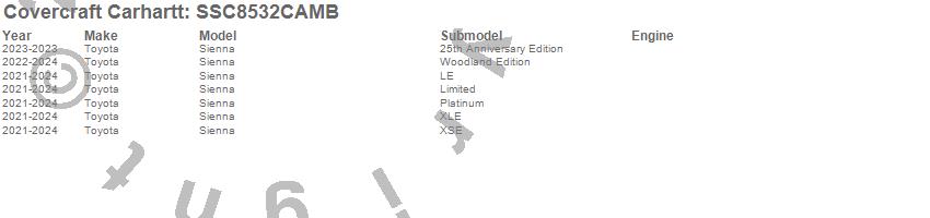 Below is an abbreviated list of applications for the Covercraft Carhartt SeatSaver.Sienna, Toyota, 2025, 2024, 2023, 2022, 2021