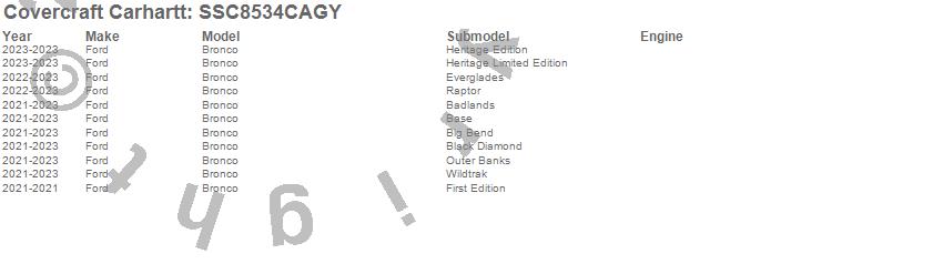 Below is an abbreviated list of applications for the Covercraft Carhartt SeatSaver.Bronco, Ford, 2025, 2024, 2023, 2022, 2021