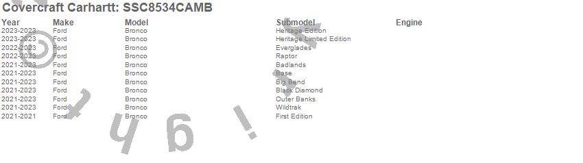 Below is an abbreviated list of applications for the Covercraft Carhartt SeatSaver.Bronco, Ford, 2025, 2024, 2023, 2022, 2021
