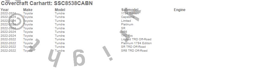 Below is an abbreviated list of applications for the Covercraft Carhartt SeatSaver.Tundra, Toyota, 2026, 2025, 2024, 2023, 2022