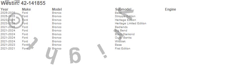 Below is an abbreviated list of applications for the XTS Pinch Weld Covers.Bronco, Ford, 2025, 2024, 2023, 2022, 2021