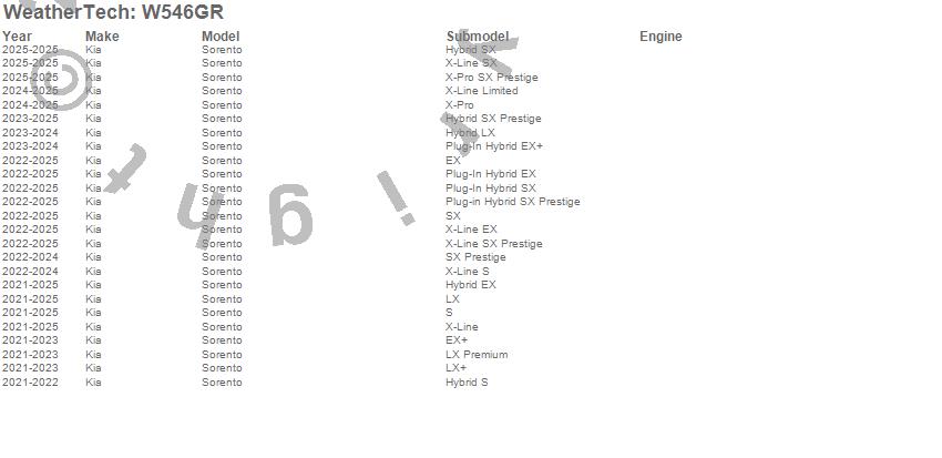 Below is an abbreviated list of applications for the All Weather Floor Mats.Sorento, Kia, 2025, 2024, 2023, 2022, 2021