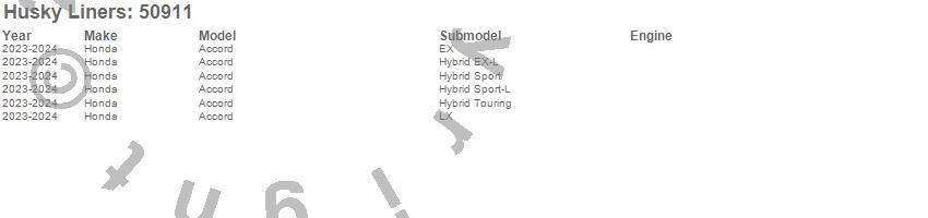Brand: Husky LinersPart Number: 50911Floor Mat Set Type: 2nd Seat - Thermoplstc Elastomer[TPE] - Black - 1 pcUPC: 753933509118