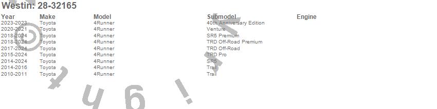 Below is an abbreviated list of applications for the Outlaw Running Boards.4Runner, Toyota, 2024, 2023, 2022, 2021, 2020, 2019, 2018, 2017, 2016, 2015, 2014, 2011, 2010